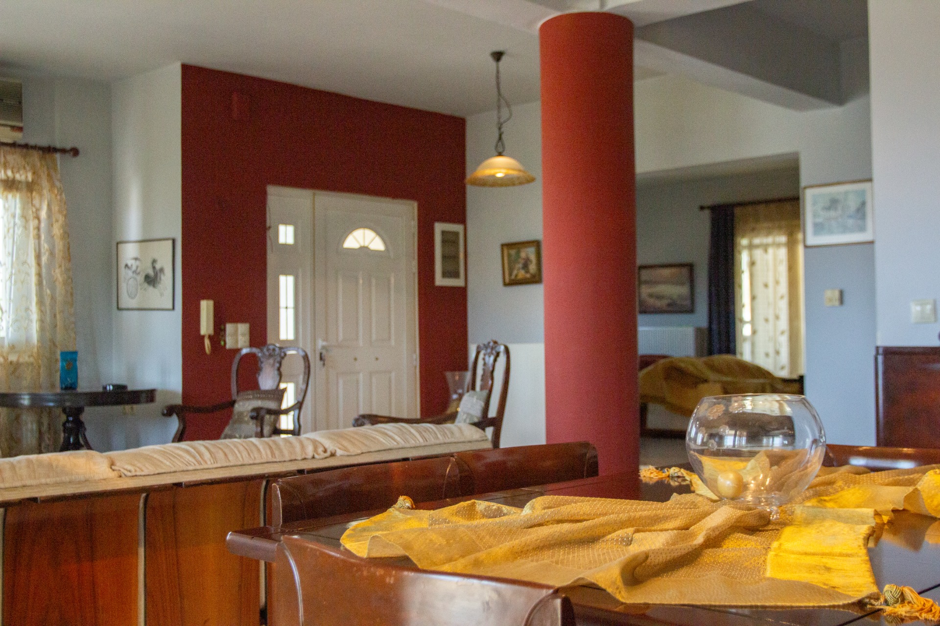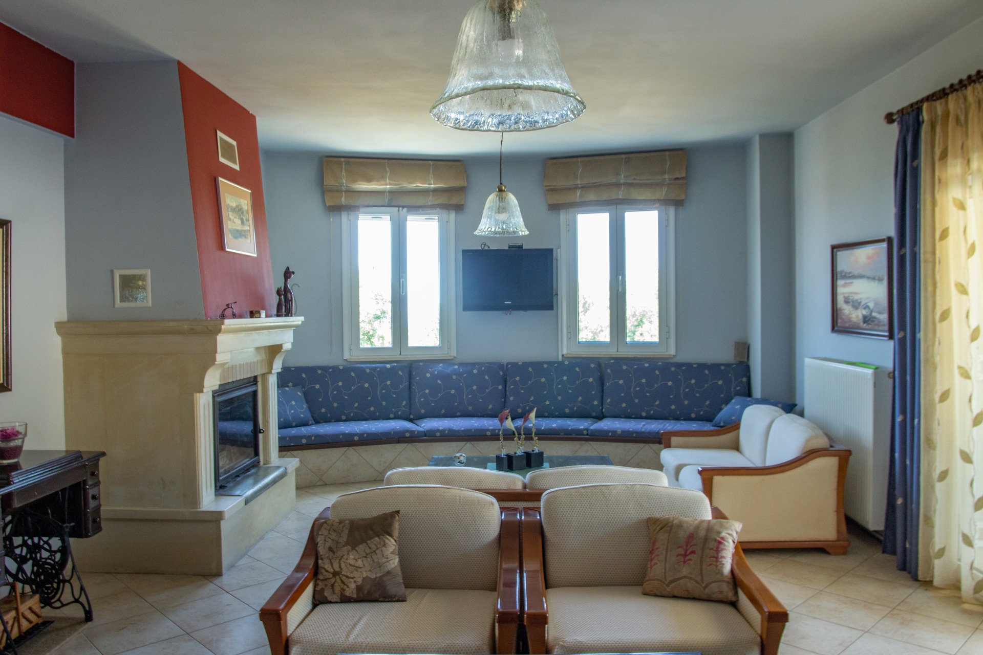 - 2ο επίπεδο (υπερυψωμένο ισόγειο, , εμβαδού 125 τ.μ.): μεγάλη σαλοτραπεζαρία, καθιστικό με τζάκι, κουζίνα και W/C .